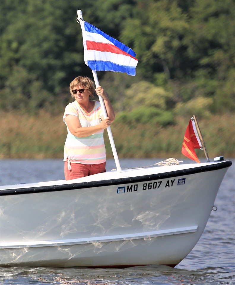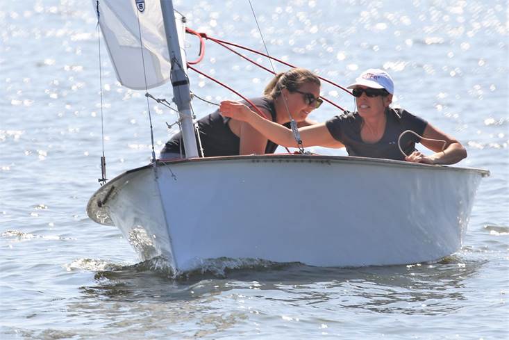 CRYC Commodore and longtime Penguin sailor Gail Owings signaling a change of course (photo by Will Keyworth)