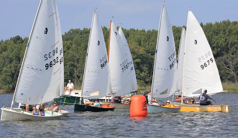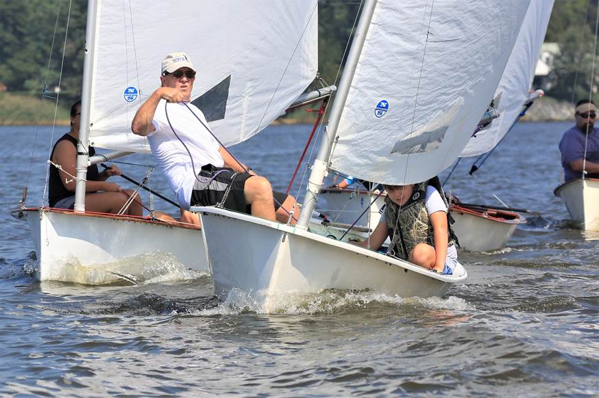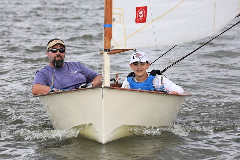 Bill Lawson and Colette Preis topped a competitive fleet of 10 Penguins for the 80th Penguin Class Championship. The Corsica River Yacht Club hosted the event from their facility at Ship Point, near Centreville, MD. Light winds Saturday delayed the start, but PRO John Foster sent us out as a light breeze started to fill in. With a westerly wind direction, the course was set up in the Corsica River, which proved to be key for the day, as the wind held long enough for three windward leeward two lap races. Elsewhere on the Bay, other events were cancelled or abandoned for lack of wind. Bill Lawson, sailing with his wife, Colette Preis, got off to a quick start, leading from start to finish in the first two races. Jonathan Bartlett, sailing with his daughter Annie, had a pair of deuces, dropping to 4th in race 2. The challenge for the day was deciding to go for the shore to avoid the incoming tide, or look for pressure or wind shifts, which sometimes favored the middle, but not consistently. Looking for and staying in pressure was key, as holes often made what seemed like a brilliant tactical move towards a favorable shift, evaporate as the wind filled in elsewhere. At the end of Saturdays racing, the Lawsons had 5 points, Charlie and Cairn Krafft 6, Jonathan and Annie Bartlett 8, RJ Bay, sailing in his third Penguin regatta, 11, and Scotty Allan sailing with his daughter Brooke, 15. A weak cold front came through Saturday evening, so forecast called for wind from the north at 5 to 10. Given the cross river (Corsica) wind direction, we headed out to the Chester River. The nearly full moon meant stronger tides, and the wind was more at the lower end of the expected range. In race 4, while the leaders headed towards the right side, looking to stay out of the current, RJ Bay saw a wind line to the left and eventually got to the 30 degree wind shift with pressure and finished well ahead of the rest of the fleet. Scotty Allan, rounding the leeward mark behind the leaders, spotted this and moved into second. Bill Lawson realized the right wasn’t working and salvaged a third. Jeff Cox, sailing with his daughter Ellie, had a regatta best 4th. RJ Bay also took race 5, nosing out the Krafft’s at the finish line. For race 6, the current was (almost) slack and going right on the somewhat shorter windward leg (shortened and shifted left after race 4), turned out not to be the best move. Jonathan Bartlett lead the pack on the left and worked ahead of RJ Bay on the run to take the gun, with Bill Lawson sealing the regatta victory with a 2nd. RJ Bay capped off an incredible day with 1,1,3 finishes to move into 2nd overall. Scotty Allan posted a 2,3,6, on Sunday to stay in 5th. Sandy McAllister, sailing with Ian Cox, took a regatta best 4th in the final race to finish 6th overall. The point spread from 6th to 9th was two points, with Scott Leppert, sailing his dad’s (Skip Moorhouse) boat with his son Elliott, finishing in 7th and taking the Len Penso Classic Boat trophy for the top classic boat. Now we just need to find the trophy. In 9th was the female team of Devon Feusahrens sailing with last minute stand-in crew of Donna McKenzie. And rounding out the top ten was Ned Foster, sailing the newly restored Penguin 666, which his father, John – also the PRO – spent the winter rebuilding with the assistance of Art Silcox. Unfortunately, a leak near the transom sent Ned promptly back to shore on Saturday, so we don’t have photos to share of the gorgeous and complete restoration job that John and Art did.