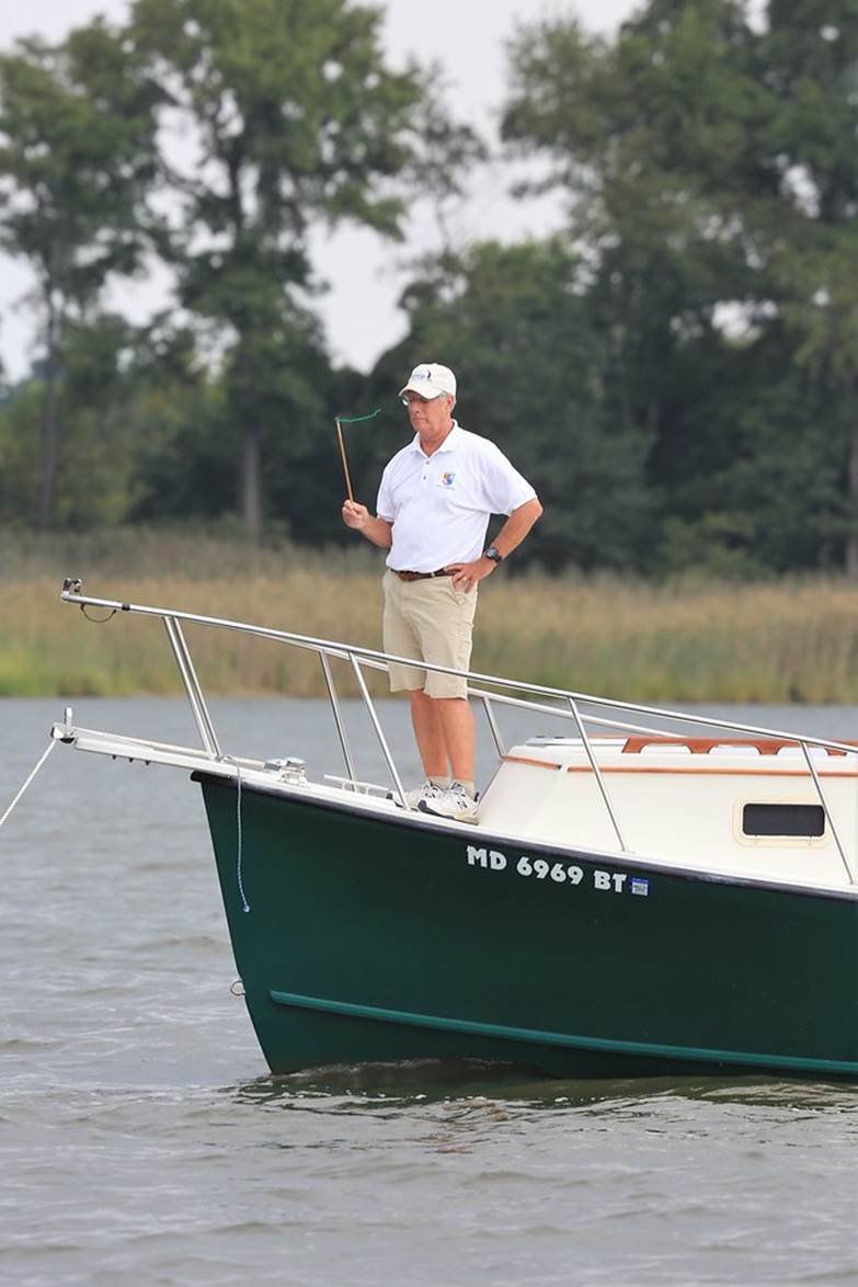Bill Lane on the bow of the committee boat, checking the wind direction. (Photo by Will Keyworth)