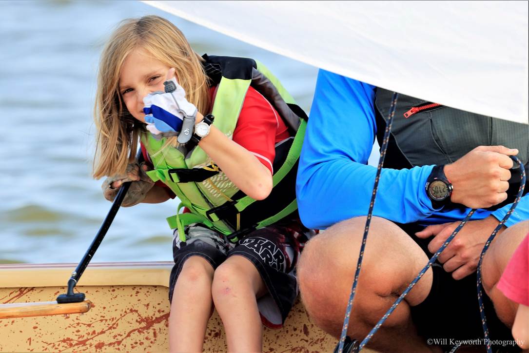 RJ Bay passing close to the Hallie Q with his mom, Heidi, who also was the PRO, observes. The twins, Amelia (on the RC boat), and Hannah, traded places each race. Photo by Will Keyworth.