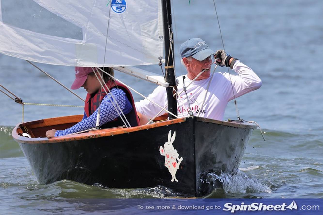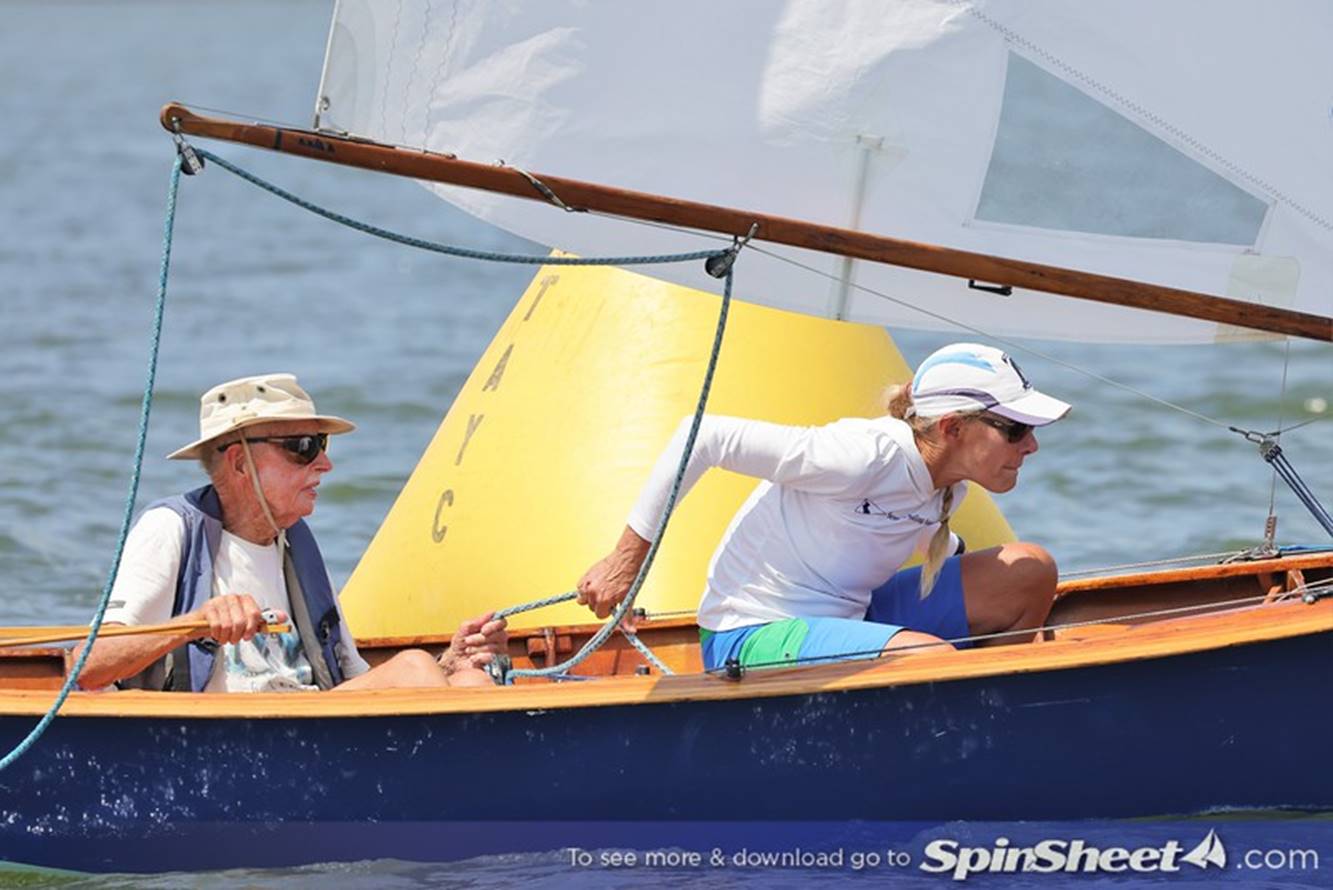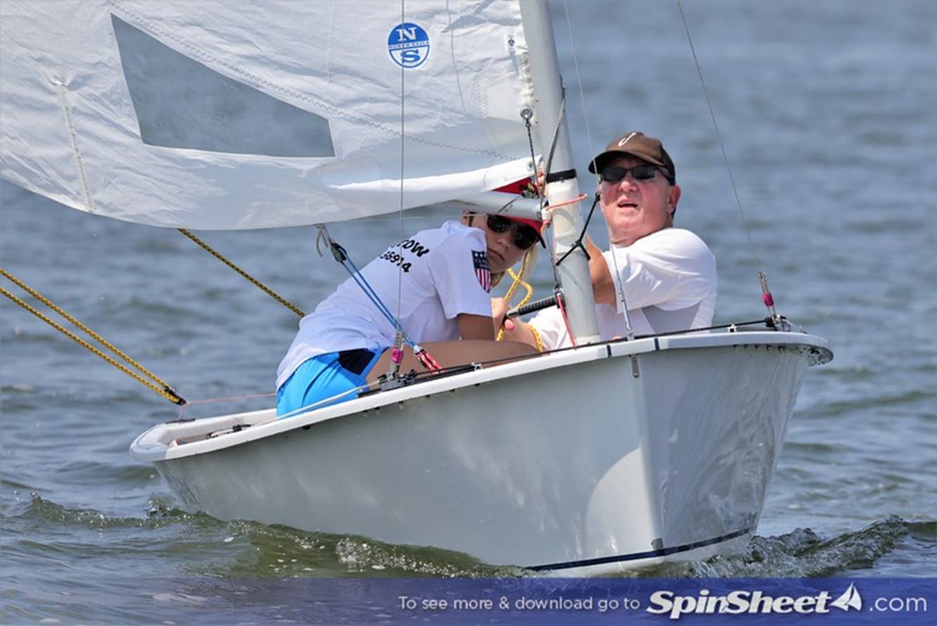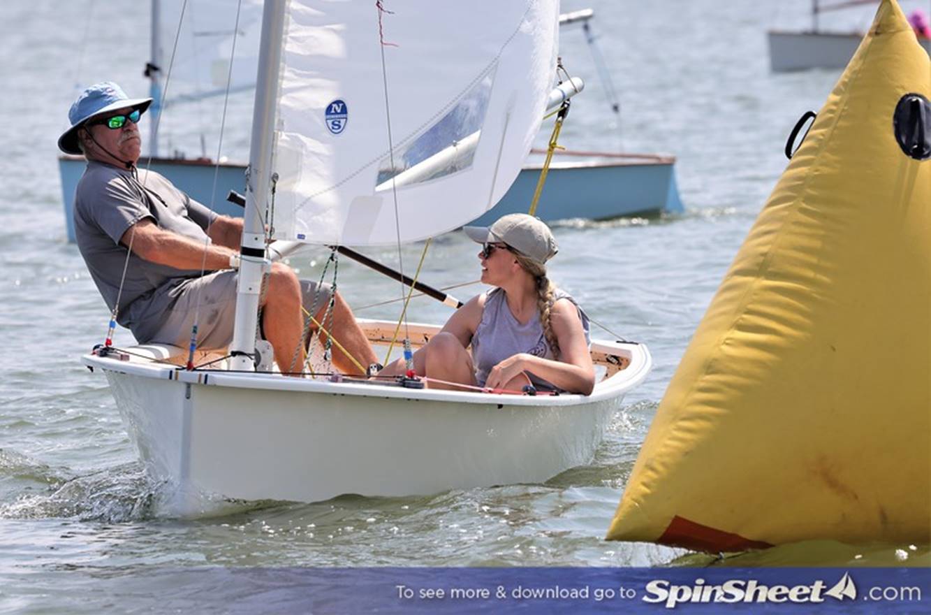 Bill Lane gnawing on his mainsheet as granddaughter Annabelle Lane adjusts the shroud.
