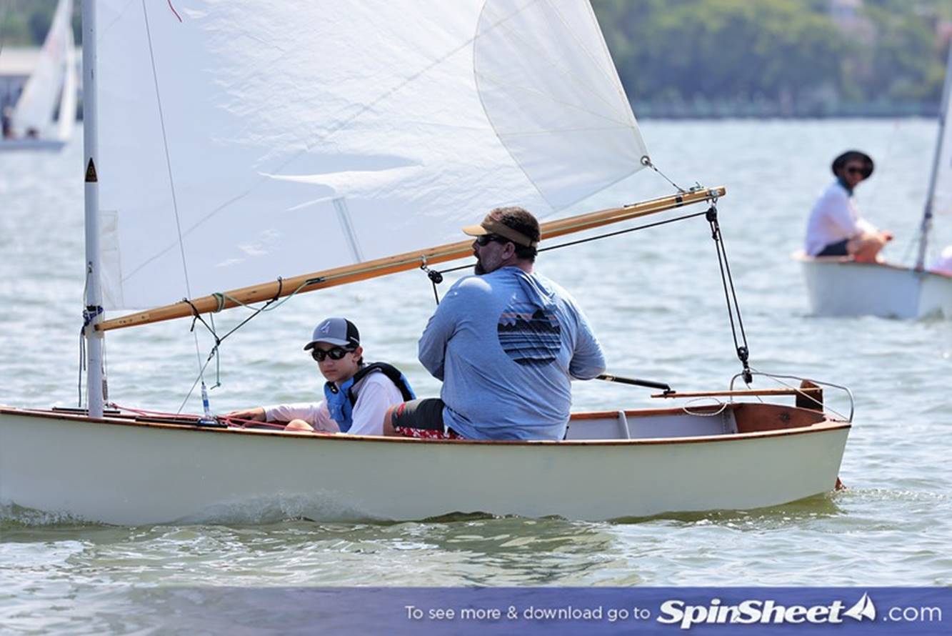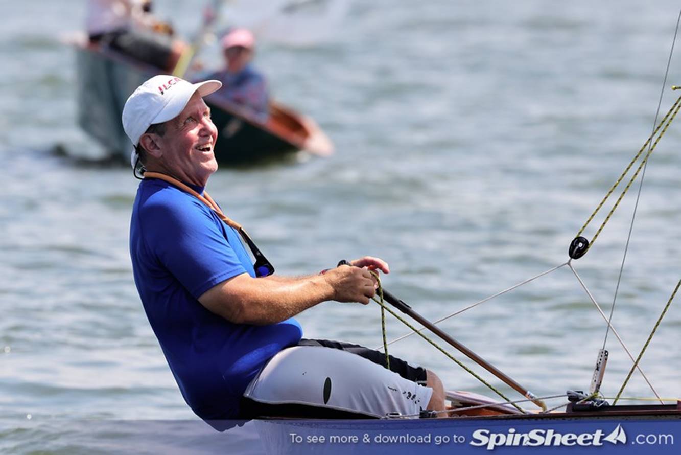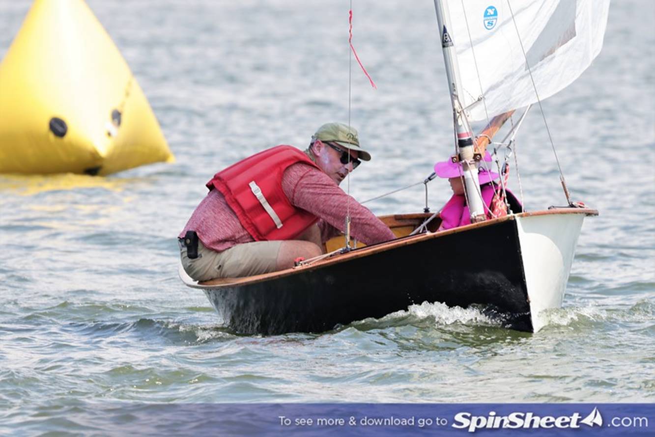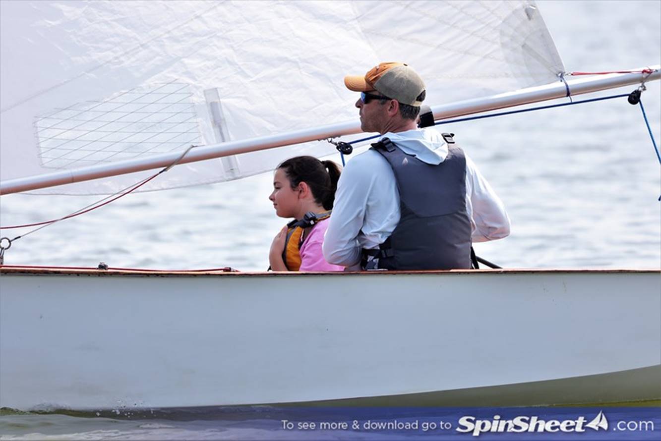 Bill Lane gnawing on his mainsheet as granddaughter Annabelle Lane adjusts the shroud.