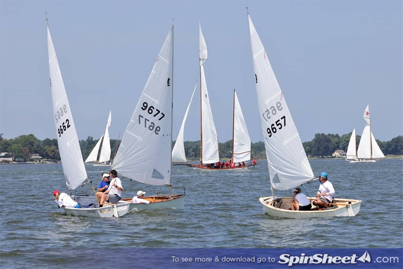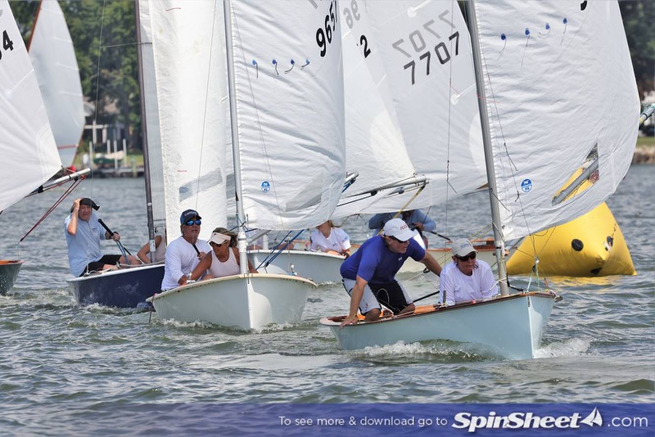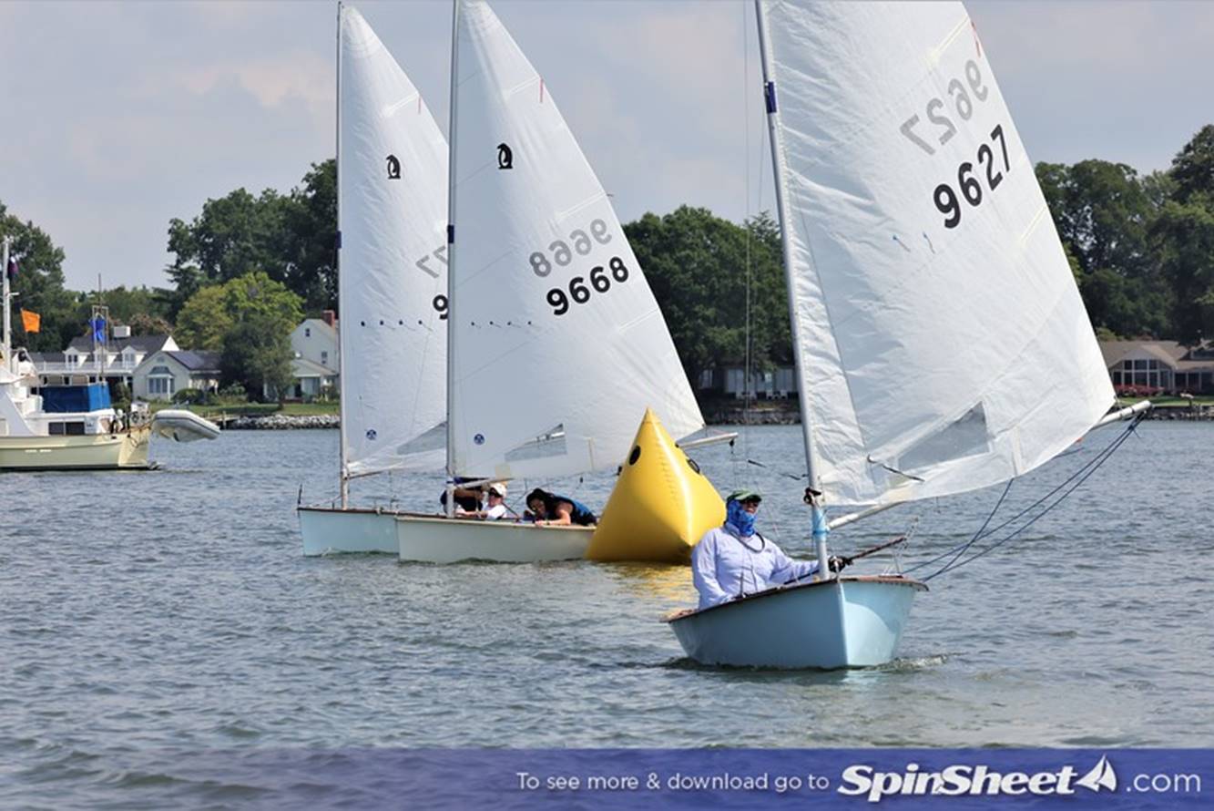 Bill Lawson leading a pack around the weather mark. Wait, is that a Penguin with a jib? No, a pesky Comet that we shared the course with. Photo by Will Keyworth.